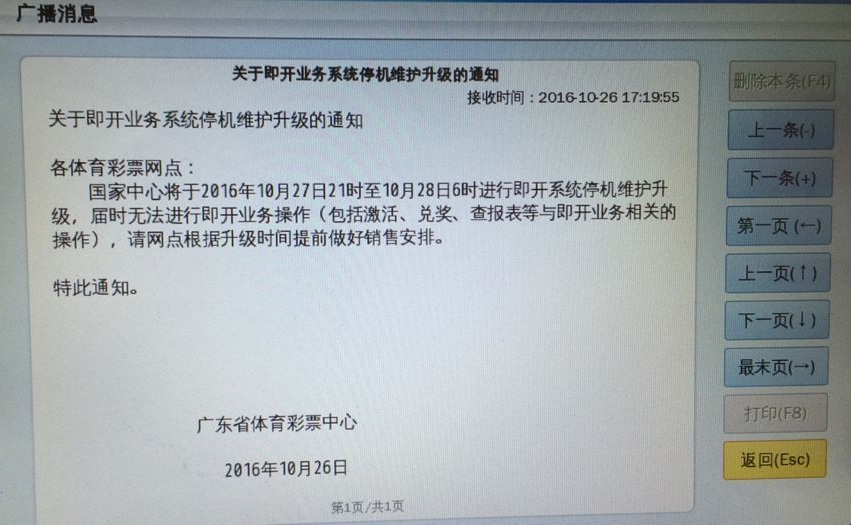国家中心将于2016年10月27日21时至10月28日6时进行即开系统停机维护升级,届时无法进行即开业务操作(包括激活、兑奖、查报表等与即开业务相关的操作),请网点根据升级时间提前做好销售安排。