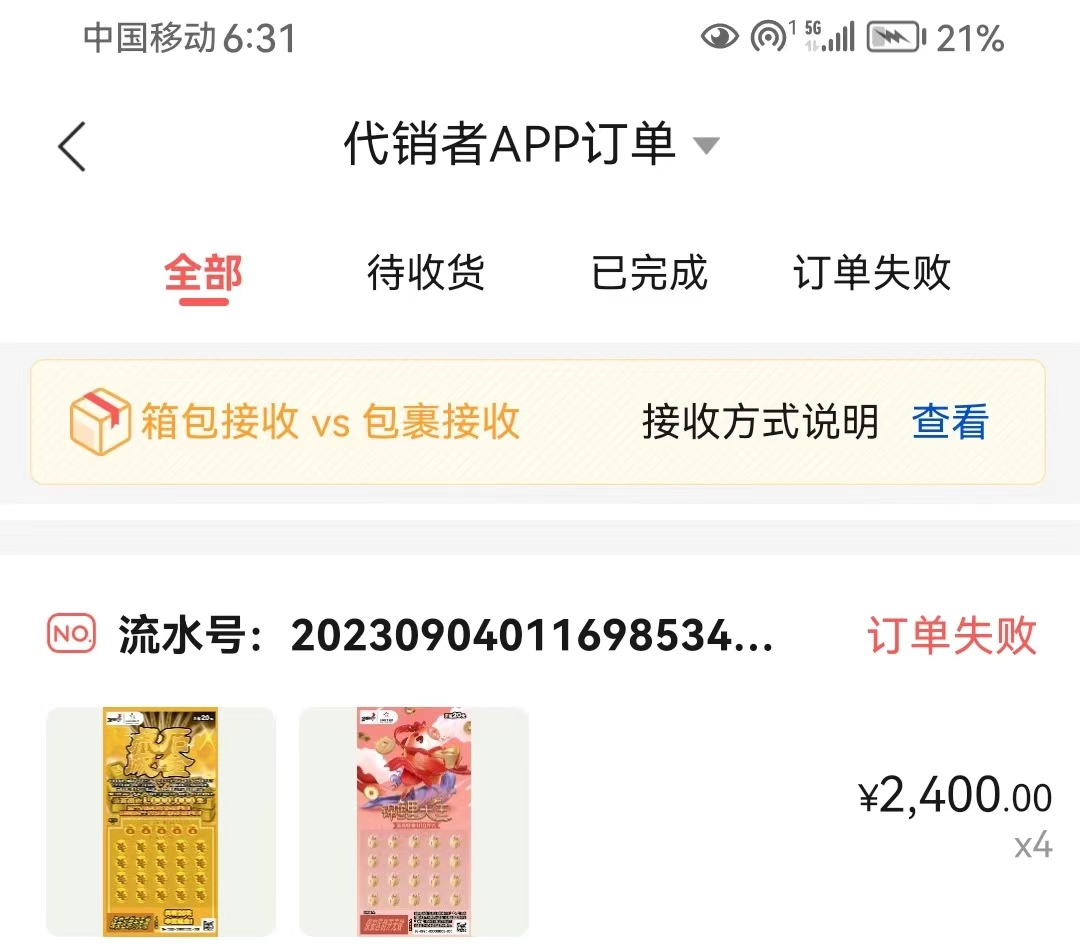 今日佛山地区(含顺德)已下单的网点请尽快登录代销者APP,点击首页右下角“个人中心”进入“我的订单”核实订票是否成功,如果页面显示“订单失败”请于今日(9月4日)19:00后在广东即开配送平台重新下单订票。如已订票成功,请不要重复下单,以免影响出库。