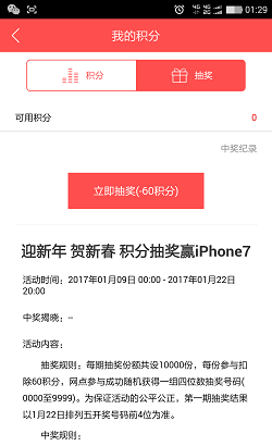 抽奖规则:一共开设3期抽奖,每期抽奖份额共设10000份,每份参与扣除60积分,网点参与成功随机获得一组四位数抽奖号码(0000至9999)。为保证活动的公平公正,抽奖结果以抽奖当日排列五开奖号码前4位为准。