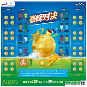 其中一款票是50元的巅峰对决,顶呱刮首款50元产品,每包20张,1000元/包。票面主题为欧洲五大足球联赛,玩法为找奖金符号+比大小,奖级主要集中在600-1600元,是目前600-1600元范围内出奖比例和金额最高的产品。