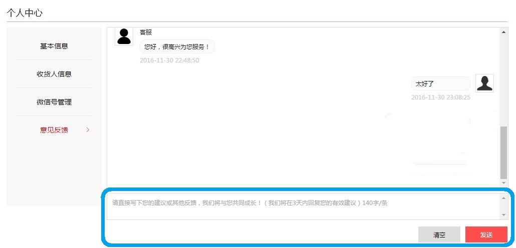 第三步:在意见反馈界面底部输入框输入内容发送即可。