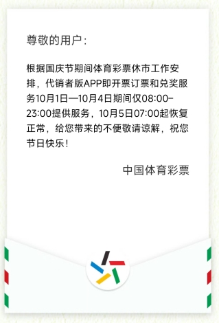 根据国庆节期间体育彩票休市工作安排,代销者版APP即开票订票和兑奖服务10月1日-10月4日期间仅08:00-23:00提供服务,10月5日07:00起恢复正常,给您带来的不便敬请谅解,祝您节日快乐!