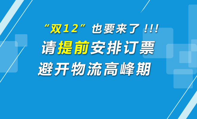 今年“双12”正值广东即开票集中配送服务全省试点期间,为了避免物流高峰期对即开票配送造成影响,请广大销售网点提前做好订票安排,错开物流高峰期(预计为12月12日至20日)。